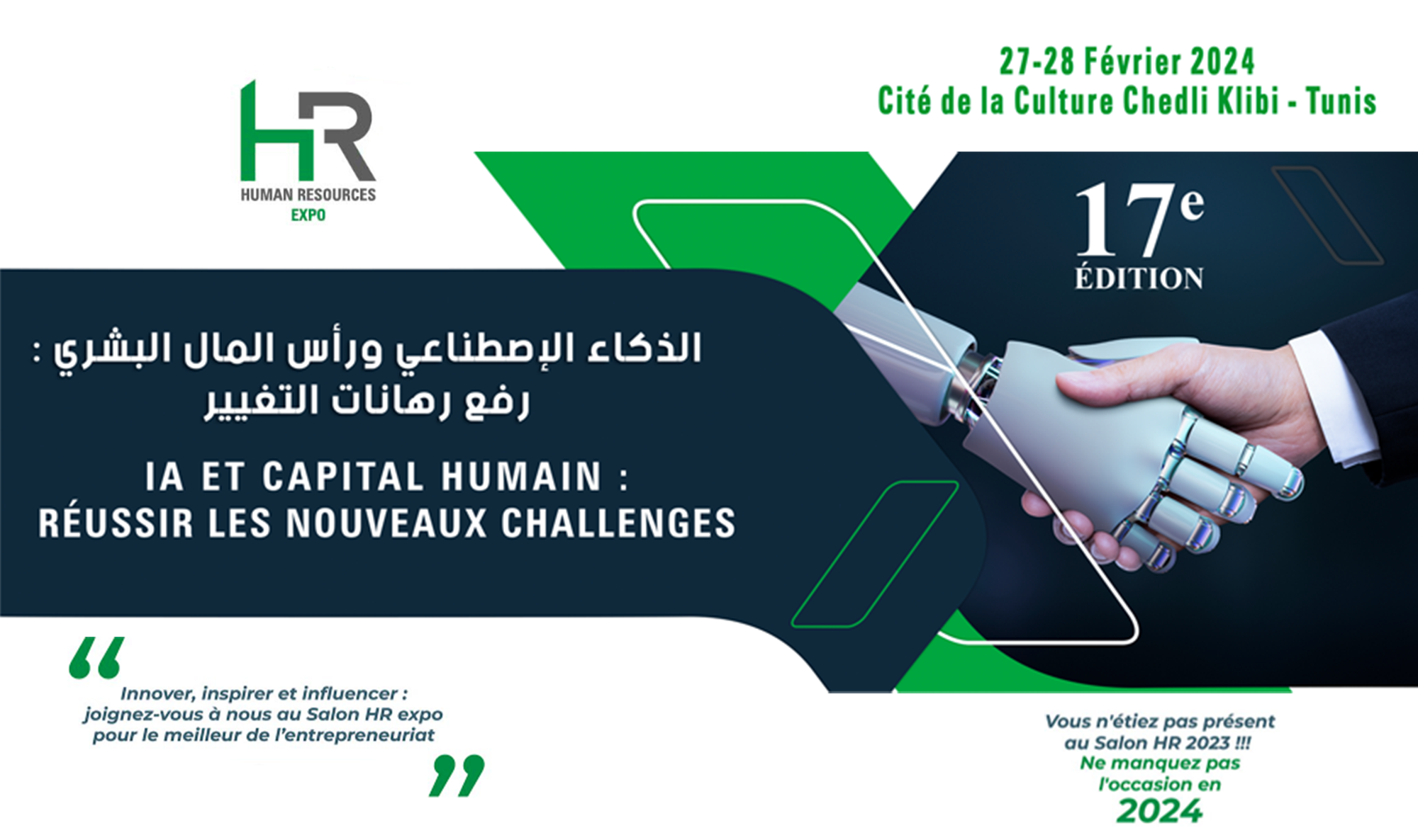 Les 27 et 28 février 2024, ne manquez pas le rendez-vous incontournable des dirigeants d'entreprises, responsables RH et experts en solutions d'information à la Cité de la Culture de Tunis - HR Expo, le Salon des outils et services dédiés aux professionnels.